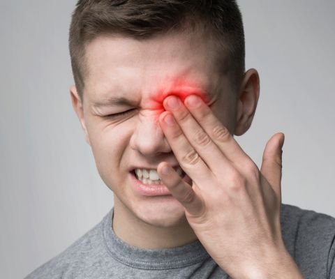 Dor ou pressão no rosto; (testa, olhos, bochechas);