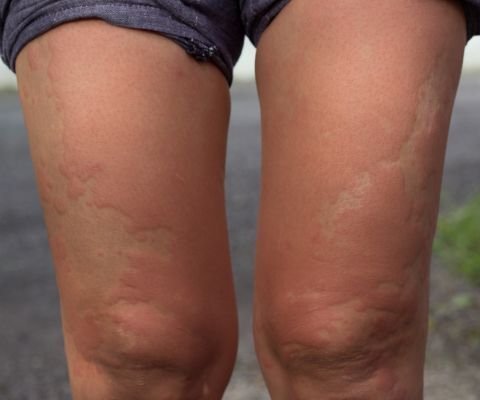 É uma condição marcada pelo aparecimento de placas avermelhadas e elevadas, que se espalham pelo corpo e vêm acompanhadas de coceira intensa. Elas podem durar algumas horas e depois sumir… só pra aparecer de novo em outro lugar.